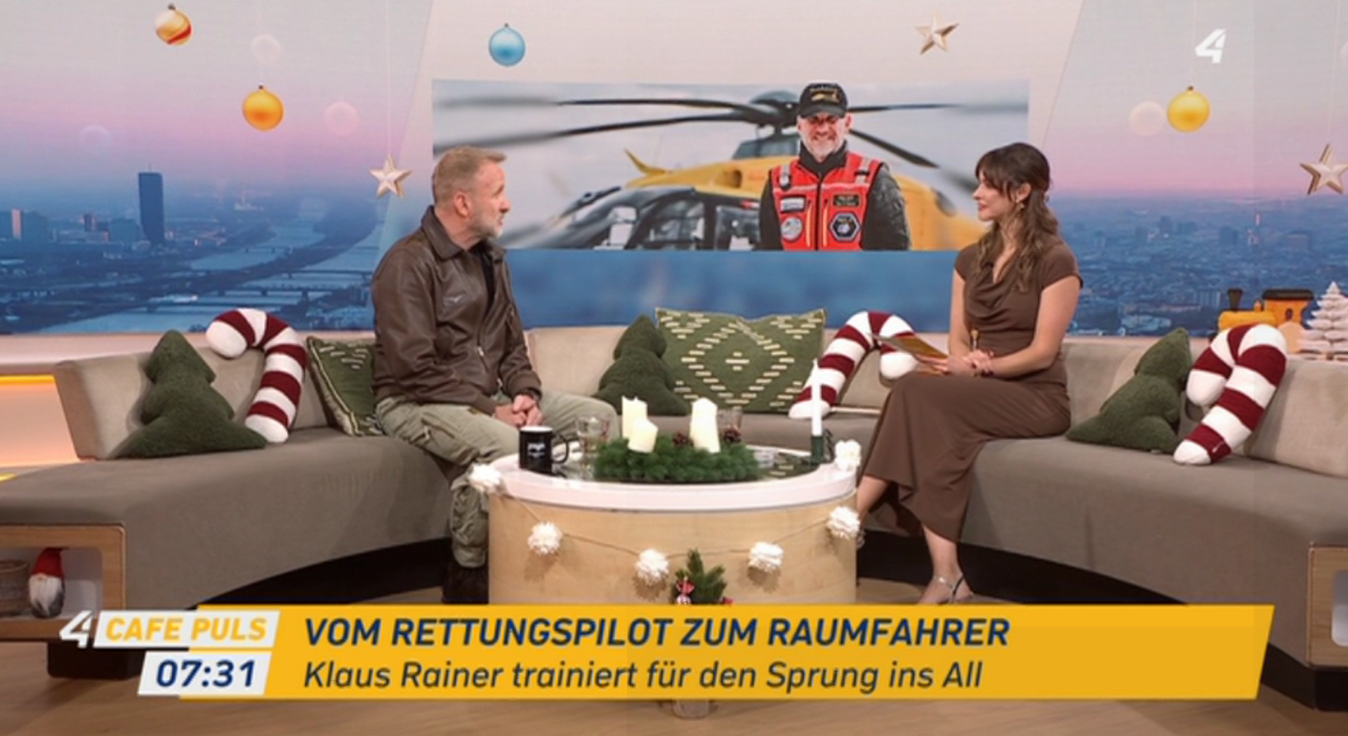 Live stream: Klaus Rainer interviewed by Julia Furdea in the Cafe Puls studio. A profile of an experienced military and rescue pilot with ambitions to fly into space. Insights into zero-gravity training in France. From 0600-0900 on Pro7, Sat1, Puls4 and from 0700-1200 on Puls24, or Life Stream available. Push the Cafe Puls Logo to get to the Live Stream: https://www.puls24.at/live