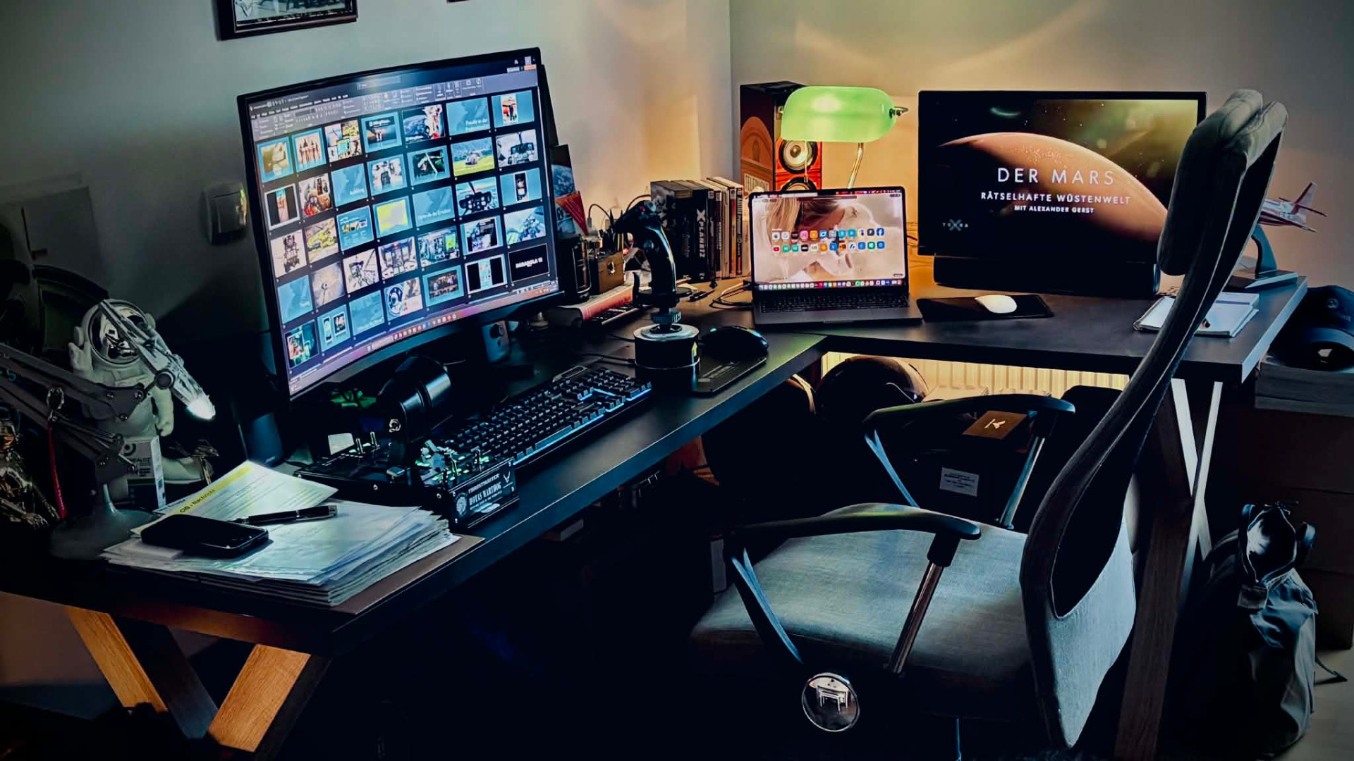 To prepare thoroughly for all training sessions, online meetings, and presentations, my multimedia equipment is now complete. This allows me to conduct research, prepare presentations, participate in online meetings at any time, or, as recently happened, be connected live from the office directly to the Riverside Studio to record a podcast. Here, I plan my strategies and future space and aviation adventures.