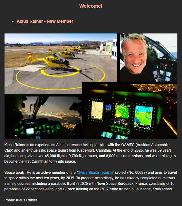 The Aviation Day of the Kapfenberg Aviation Technical College will take place on January 30, 2026 great hall at 12:00 loc time. I am looking forward to inspiring the students with my presentation. It will offer insights into military operations and EMS rescue operations. I also want to give the students further interesting insights into civilian astronaut training, such as parabolic flight training in France.