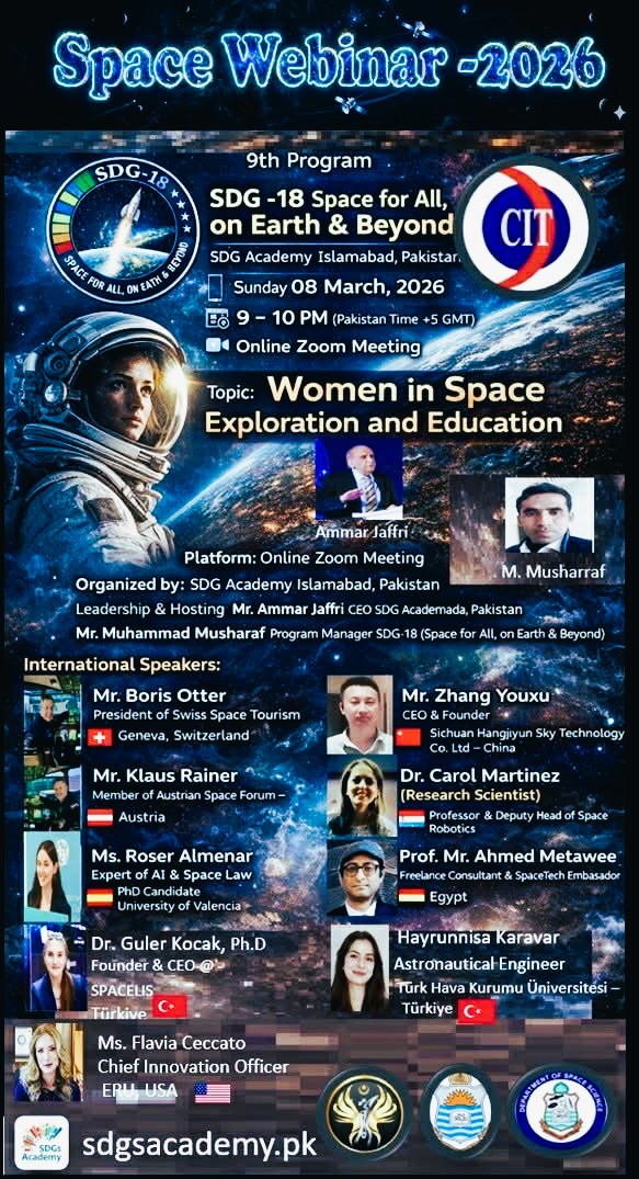 Under the SDG Academy Islamabad, Pakistan, Organized the 10th International Space Technology Conference on Sunday March 15, 2026. Top level space scientists, researchers, and key figures from space agencies wolrdwide participated, including Space Tourism President Mr, Boris OTTER and Mr. Klaus RAINER from the Austran Space Forum representative. The Confernce discussed space security and debris, making it a significant event.